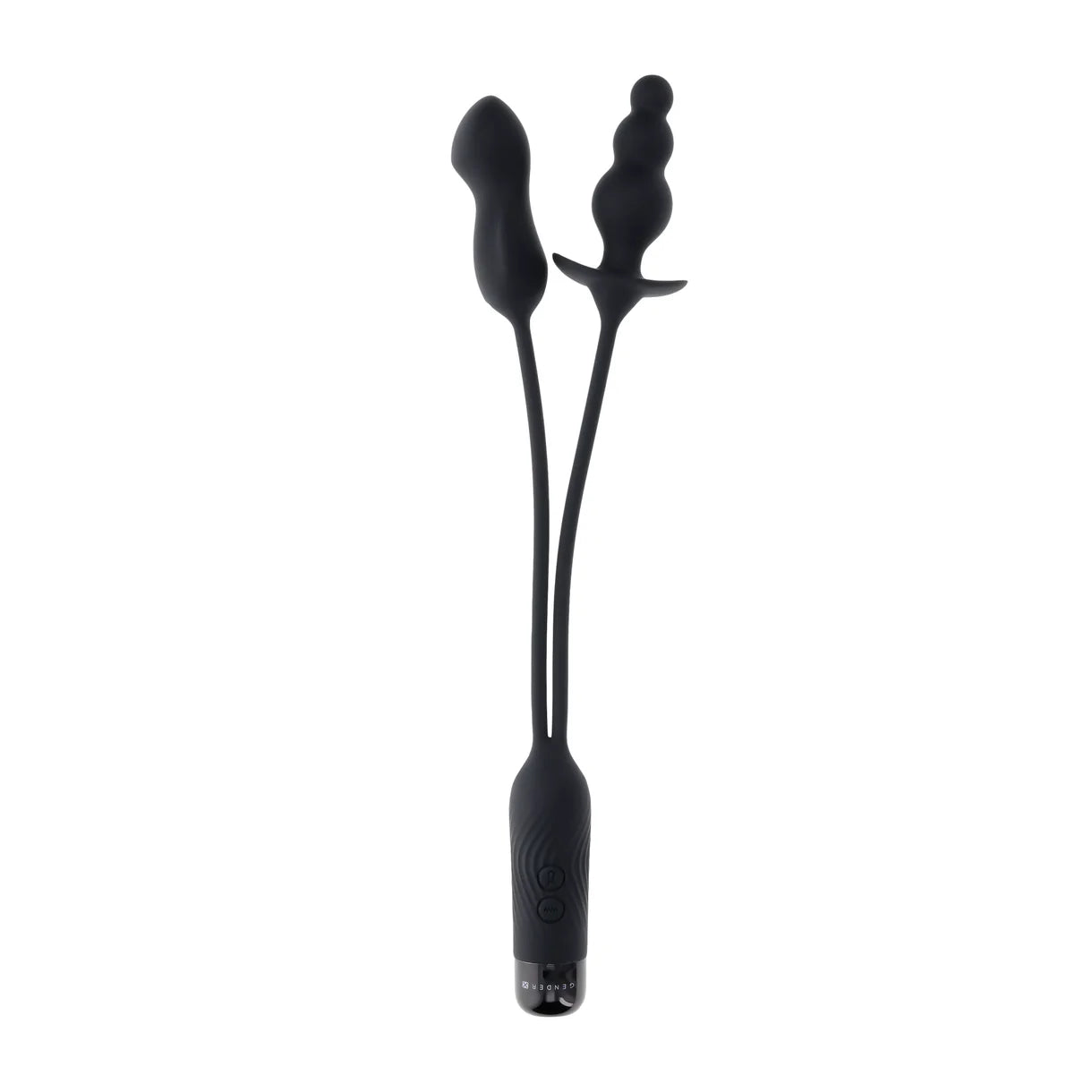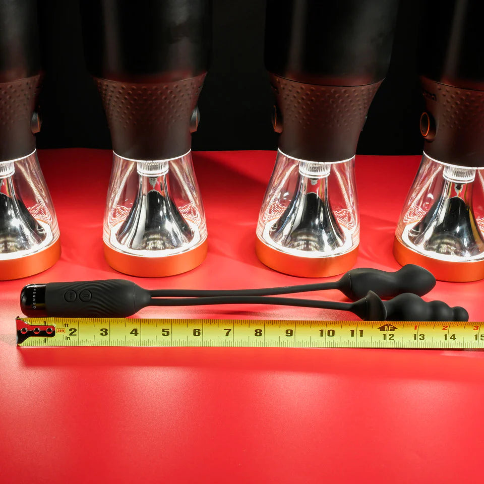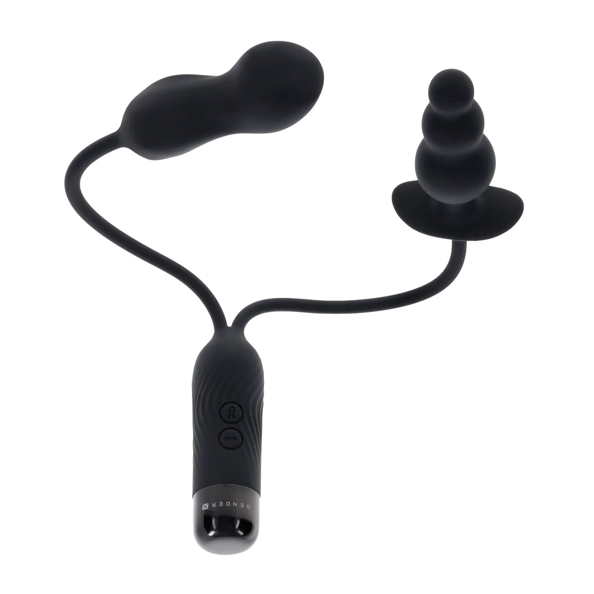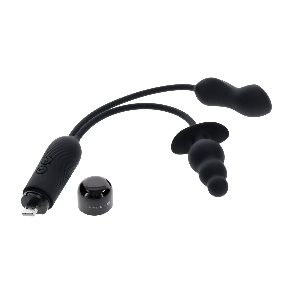 This double-motor toy features two vibrating shapes – a beaded plug and a mini-vibe each tethered by a flexible cord. The round-tip plug consists of 3 bulbs that gradually increase in size to a wide safety base. The chunky-shaped mini-vibe narrows at the center and finishes with a flattened, blunt tip. A USB plug is neatly stored under the textured handle’s screw-off cap.
