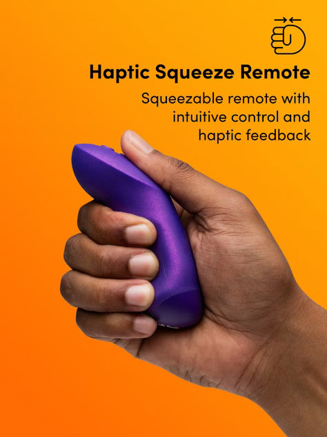 Control has never been so intuitive. The Haptic Squeeze Remote replaces buttons with an air pocket that responds to your grip, allowing you to increase or decrease intensity instantly. The remote even contains its own motor, so as you squeeze, you’ll feel matching vibrations in your hand—mirroring your partner’s experience for more intimate, connected play.