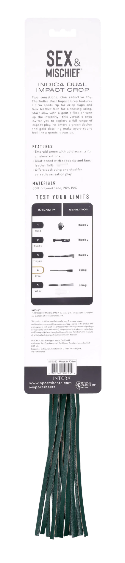 Two sensations. One seductive toy. The Indica Dual Impact Crop features a firm spade tip for crisp slaps and faux leather falls for a teasing sting. Start slow with a gentle flick or turn up the intensity—this versatile crop invites you to explore a full range of impact play. Its emerald green design and gold detailing make every scene feel like a special occasion.