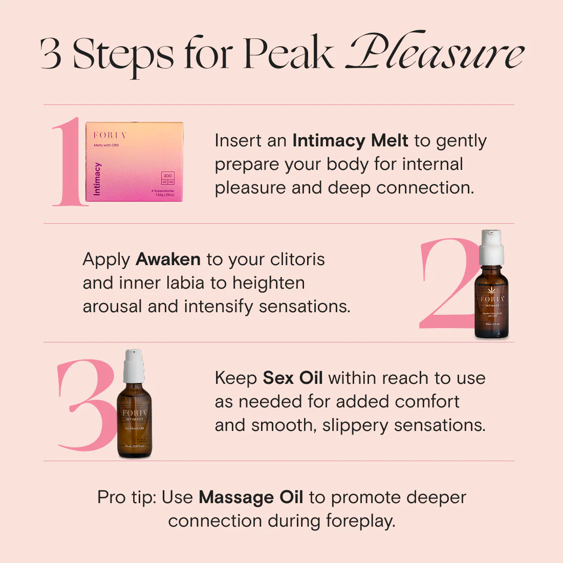 Spice things up by slowing things down. Our Intimacy Massage Oil takes partnered intimacy to the next level with quick-absorbing, desire-enhancing, all-natural moisture. Made with organic ingredients that absorb quickly, this formula allows you to skip the mess and get down to business (if you know what we mean). Get ready to connect with your partner’s secret erogenous zones and uncover a new level of relaxation that’ll leave you feeling touchable and ready for anything.