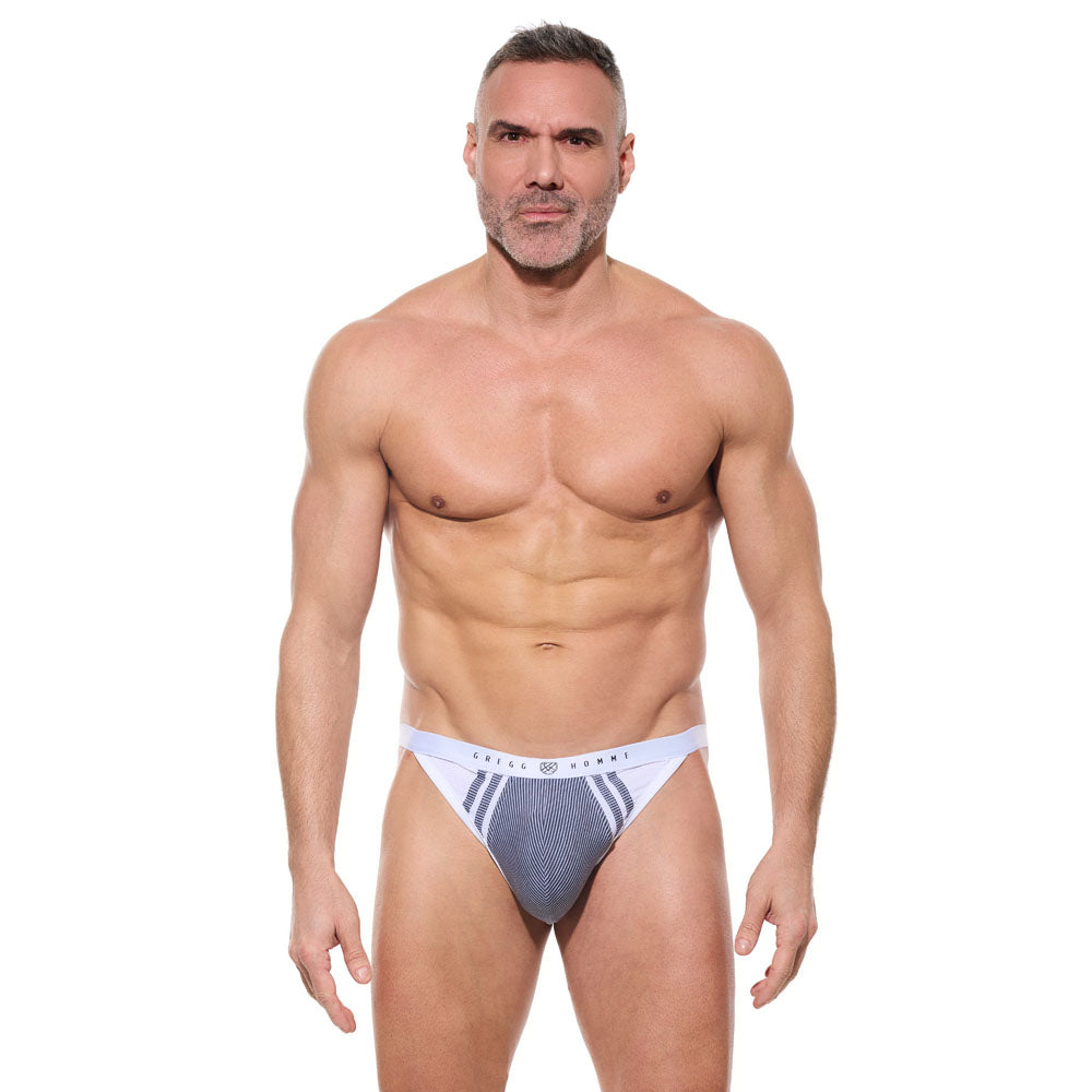 Sleek and athletic with a bold twist, the Torque Thong is built for both comfort and edge. Its breathable micro-mesh body feels ultra-light, while the striped contoured pouch includes a removable push-up pad to enhance or tone down your profile. A soft Gregg Homme logo waistband and minimalist back strap keep the fit streamlined and sexy.